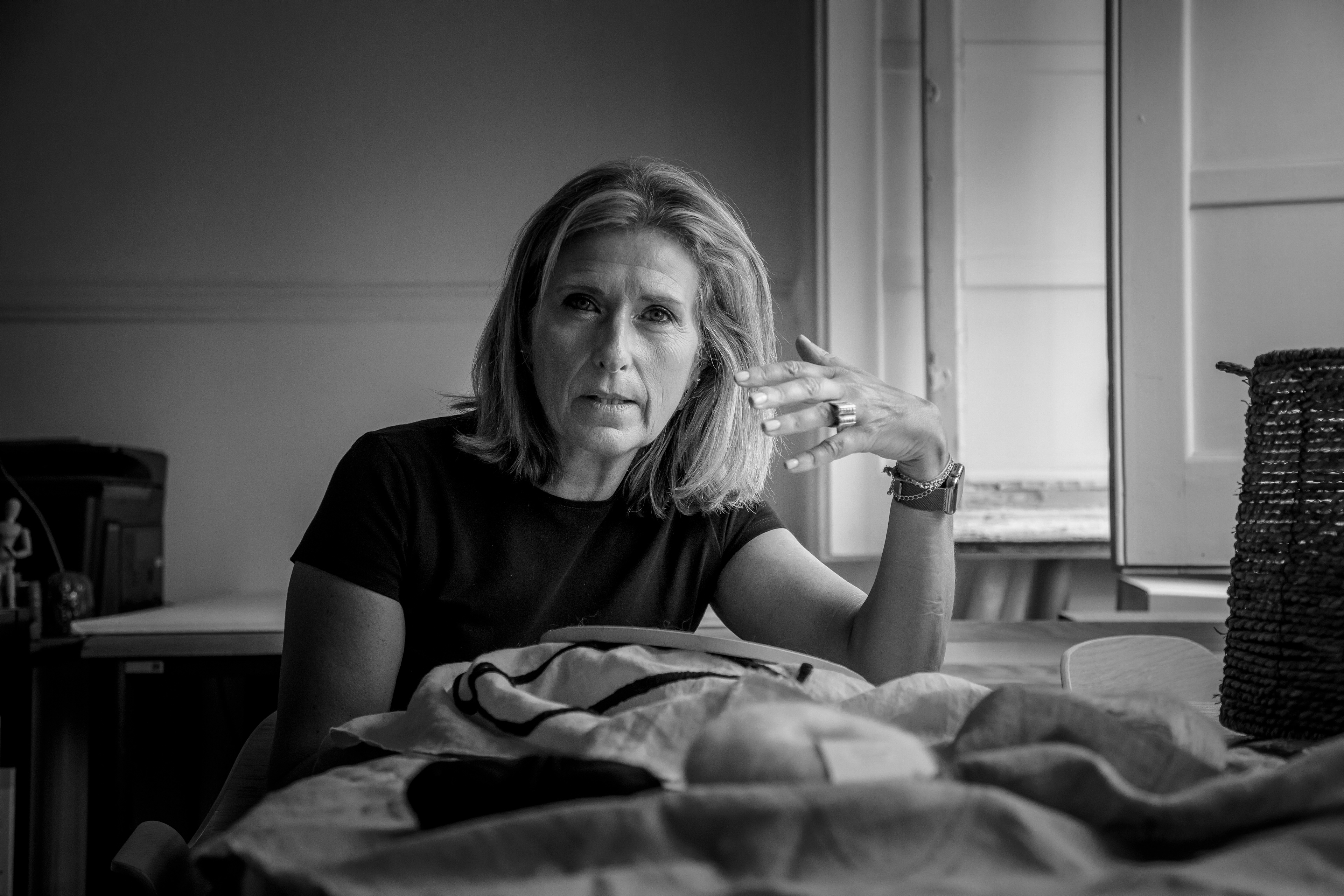 The artist works on linen as one writes on time. Each stitch marks rhythm, patience, presence. Within the apparent delicacy of the embroideries lies a structural and conceptual complexity that challenges the immediacy of the gaze.